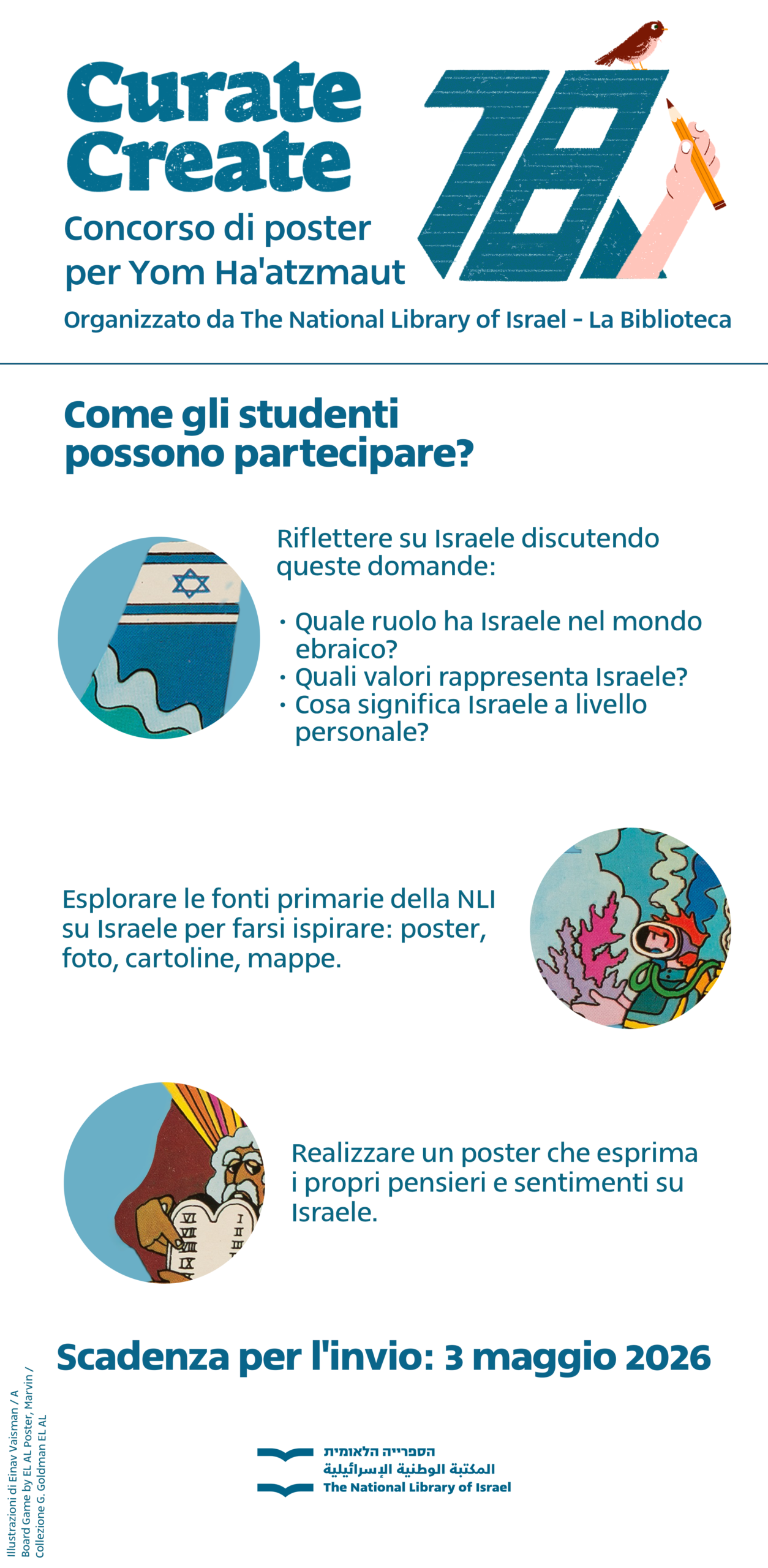 In occasione di Yom Ha’atzmaut 2026, il concorso NLI offre agli studenti l’opportunità unica di esplorare i tesori archivistici della Biblioteca, scegliendo le fonti primarie (manifesti storici, fotografie, documenti) come ispirazione per creare un proprio poster originale che rifletta il legame con Israele e i valori del popolo ebraico.